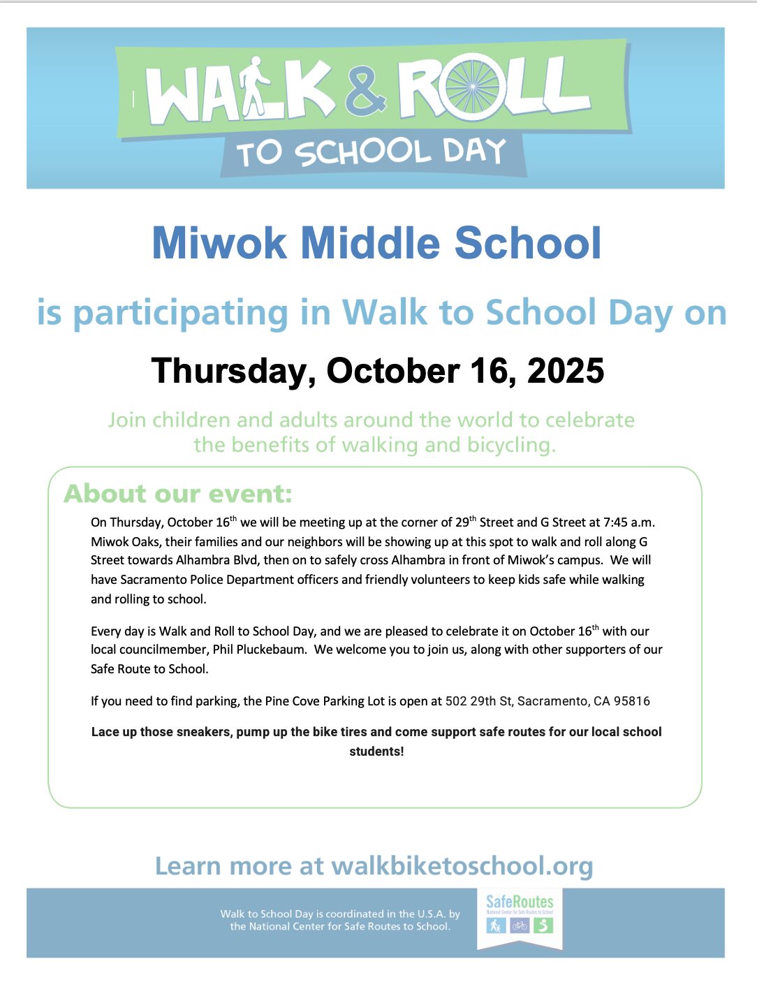 Walk and Roll to Miwok Middle School Day October 16th: Councilmember Pluckebaum will be joining many of us to celebrate National Walk and Roll to School Day this October. Every day is a good day for students to walk or roll to school, and this coming October 16th we will be meeting up at 29th St and G Street to walk or roll with students. We are excited to have the school administration involved, and look forward to having you join us. We will meet at our spot at 7:45 am, and walk, roll or ride bikes on up to Alhambra and over to Miwok. If you need parking, Pine Cove is a short walk away. MESA is thrilled to have our councilmember joining us, and we anticipate we will have some Sac PD bike officers along for the journey too. To learn about the national program, visit https://www.walkbiketoschool.